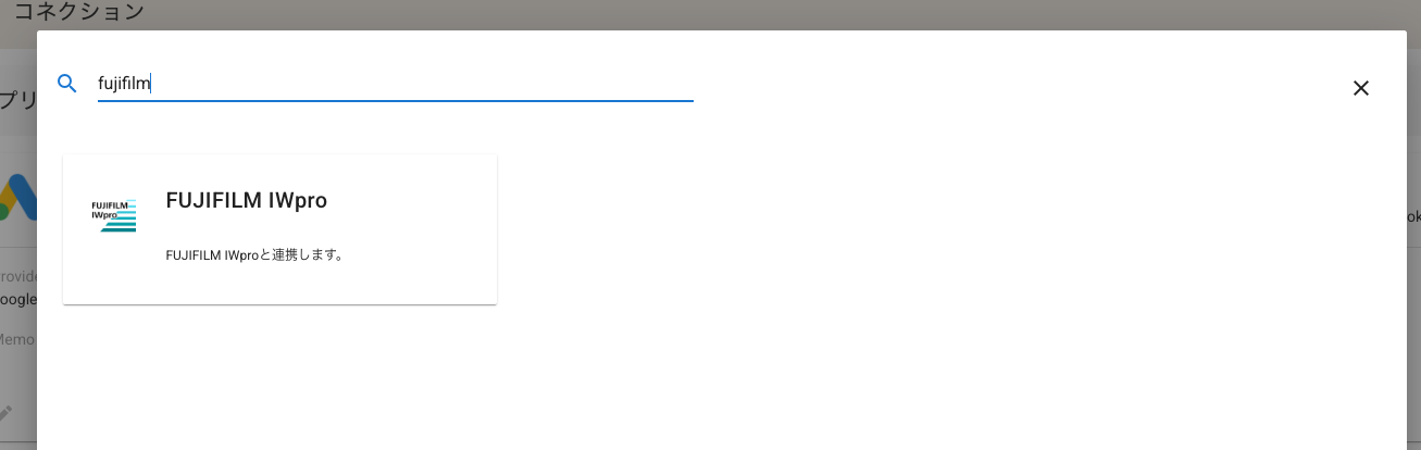 右上の「アプリケーション追加」をクリックすると連携可能なアプリケーションのリストが表示されるので、その中から「FUJIFILM IWpro」を選択します。