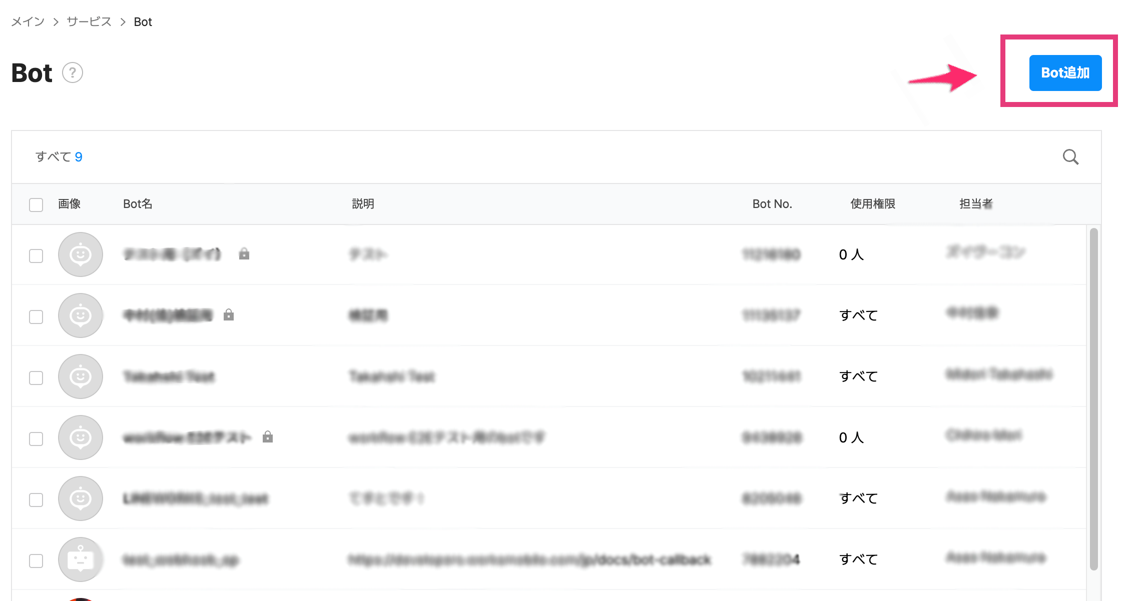続いて、管理者画面でも Bot を登録して公開しないと利用できません。LINE WORKS Admin(管理者画面)へアクセスし「Bot 追加」ボタンをクリックして Bot を登録します。